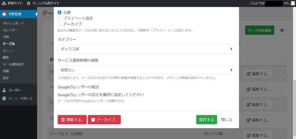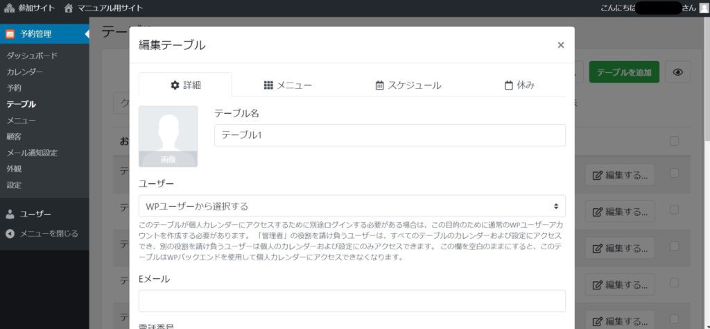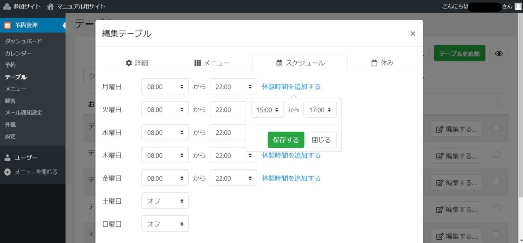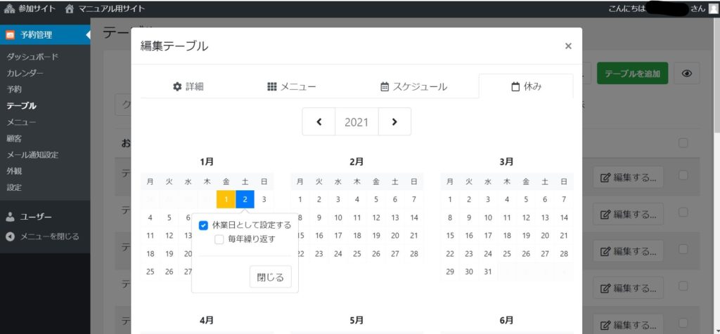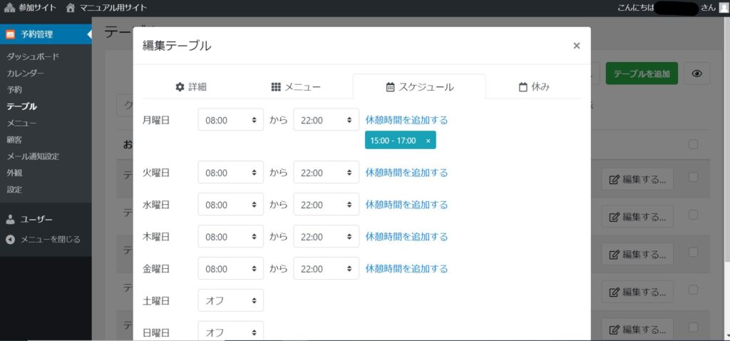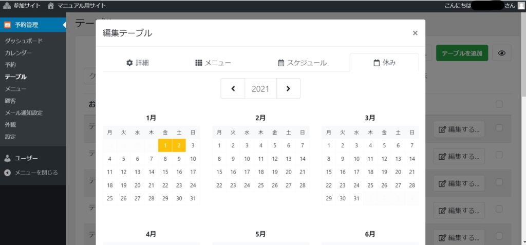 設定から休みは設定いただいていますが、テーブルごとの休みはテーブルの編集」より休みを追加してください。