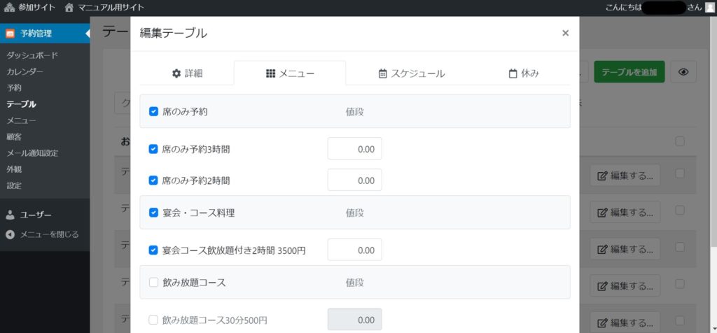 設定のテーブルで提供できないメニューがある場合はチェックを外すことができます。
